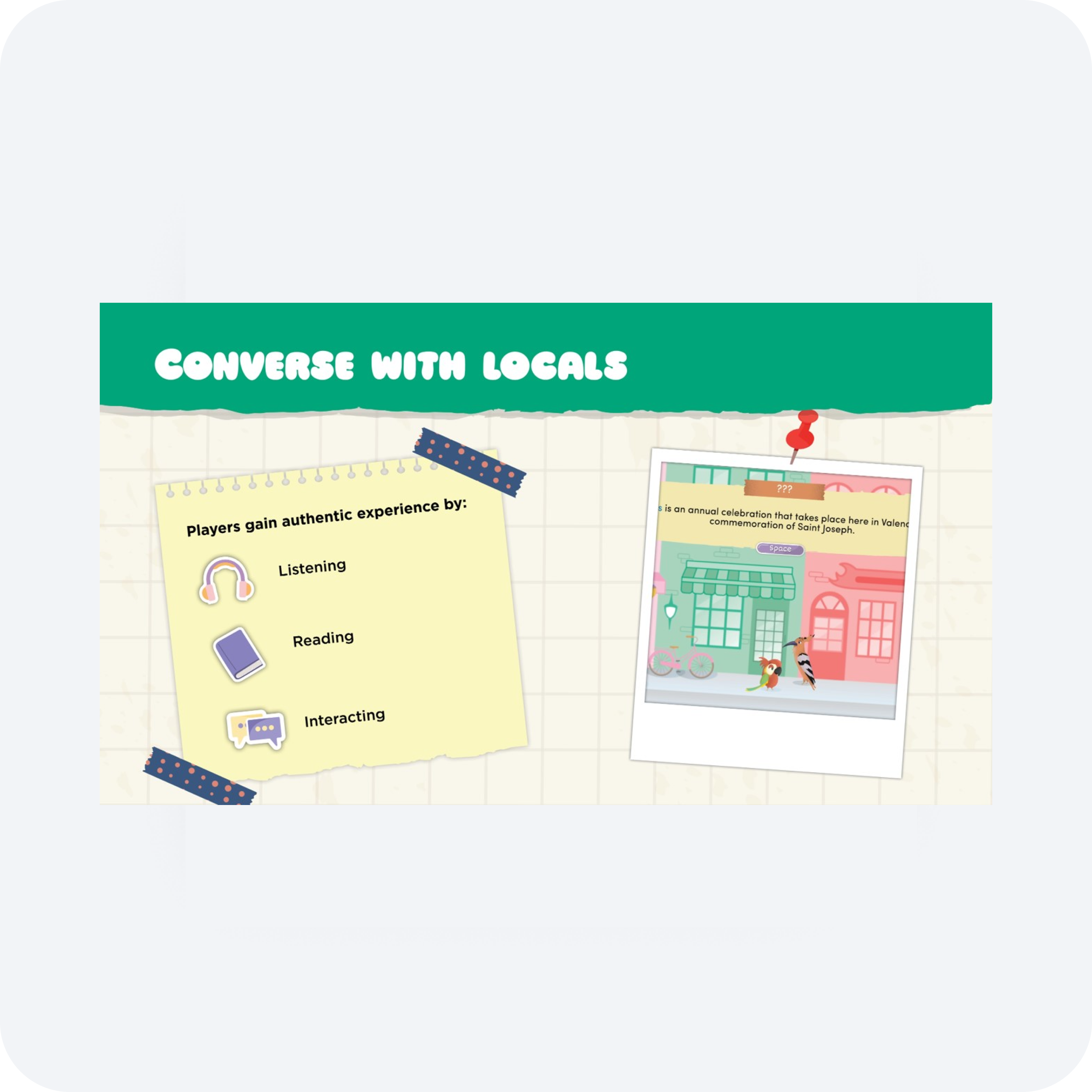 The result is a gamified, research-backed experience that feels both playful and grounded—offering learners intuitive pathways to vocabulary, grammar, and real-life communication skills, all within a visually engaging world.